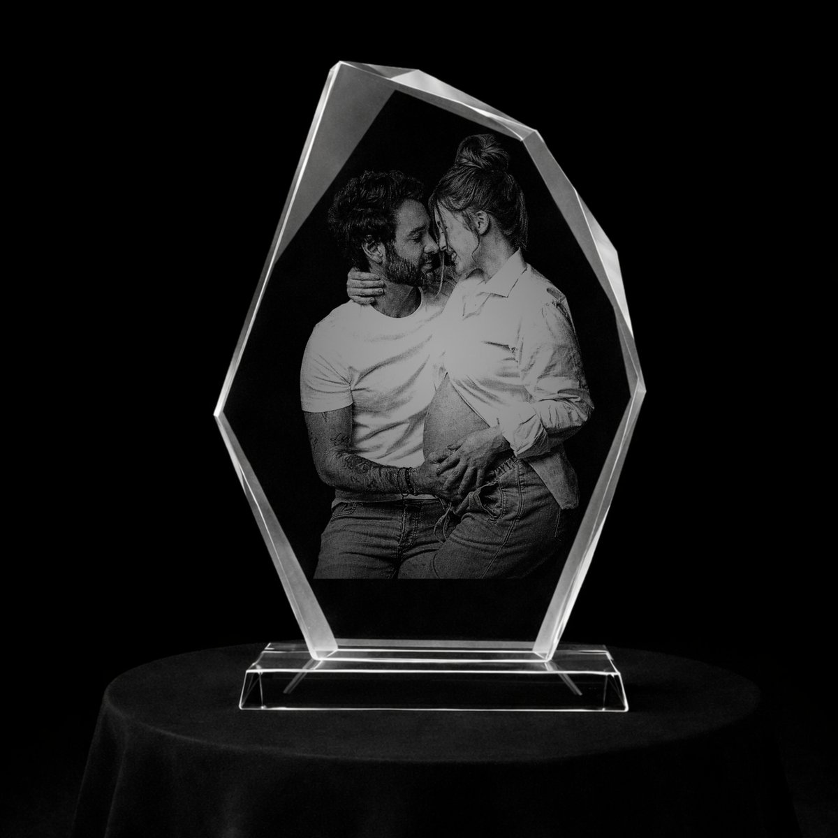 La fuerza del fuego hecha cristal, símbolo de pasión y energía. Perfecto para destacar logros, premiaciones, recuerdos que representan superación, retratos o parejas.